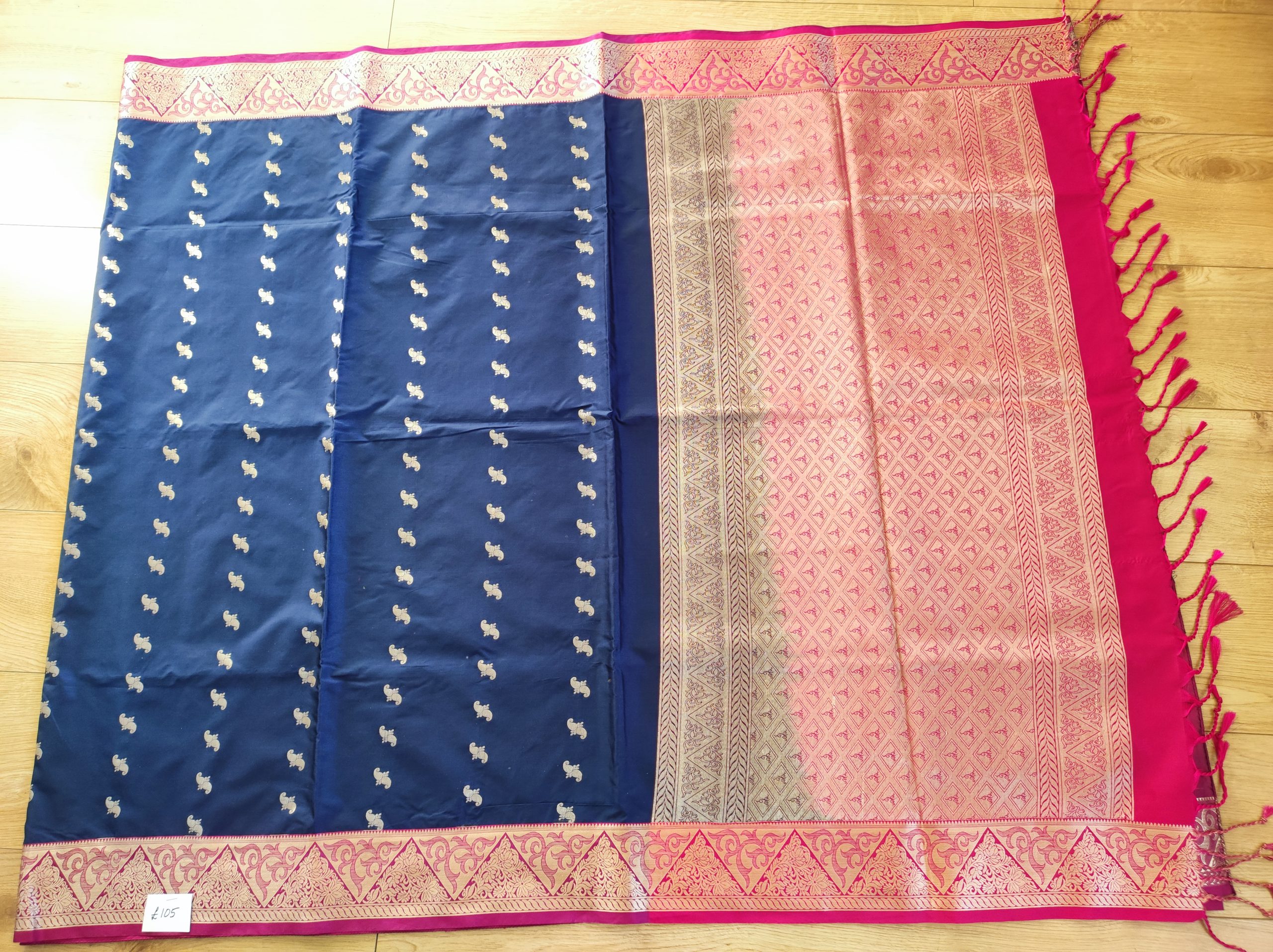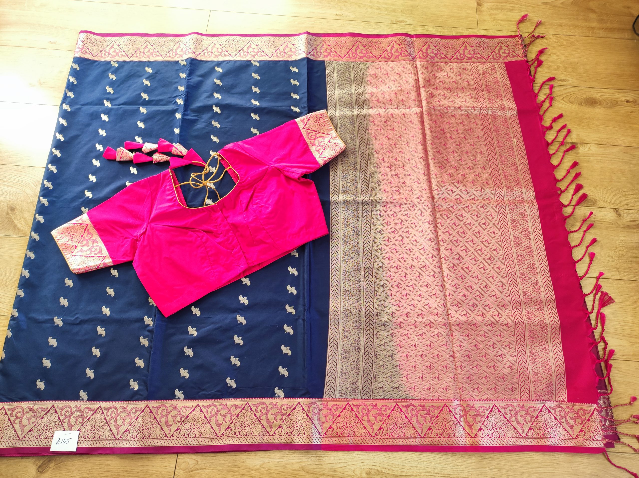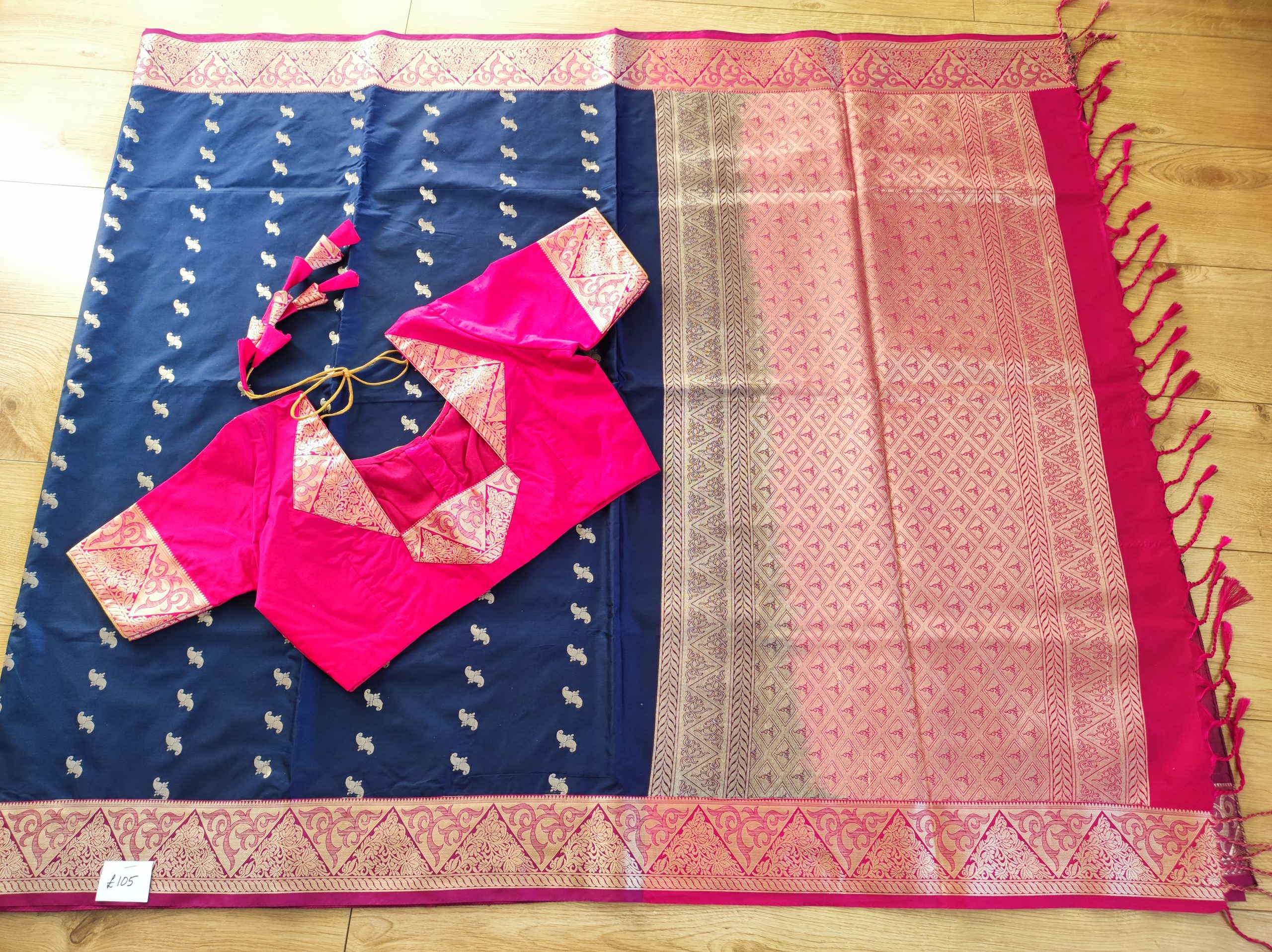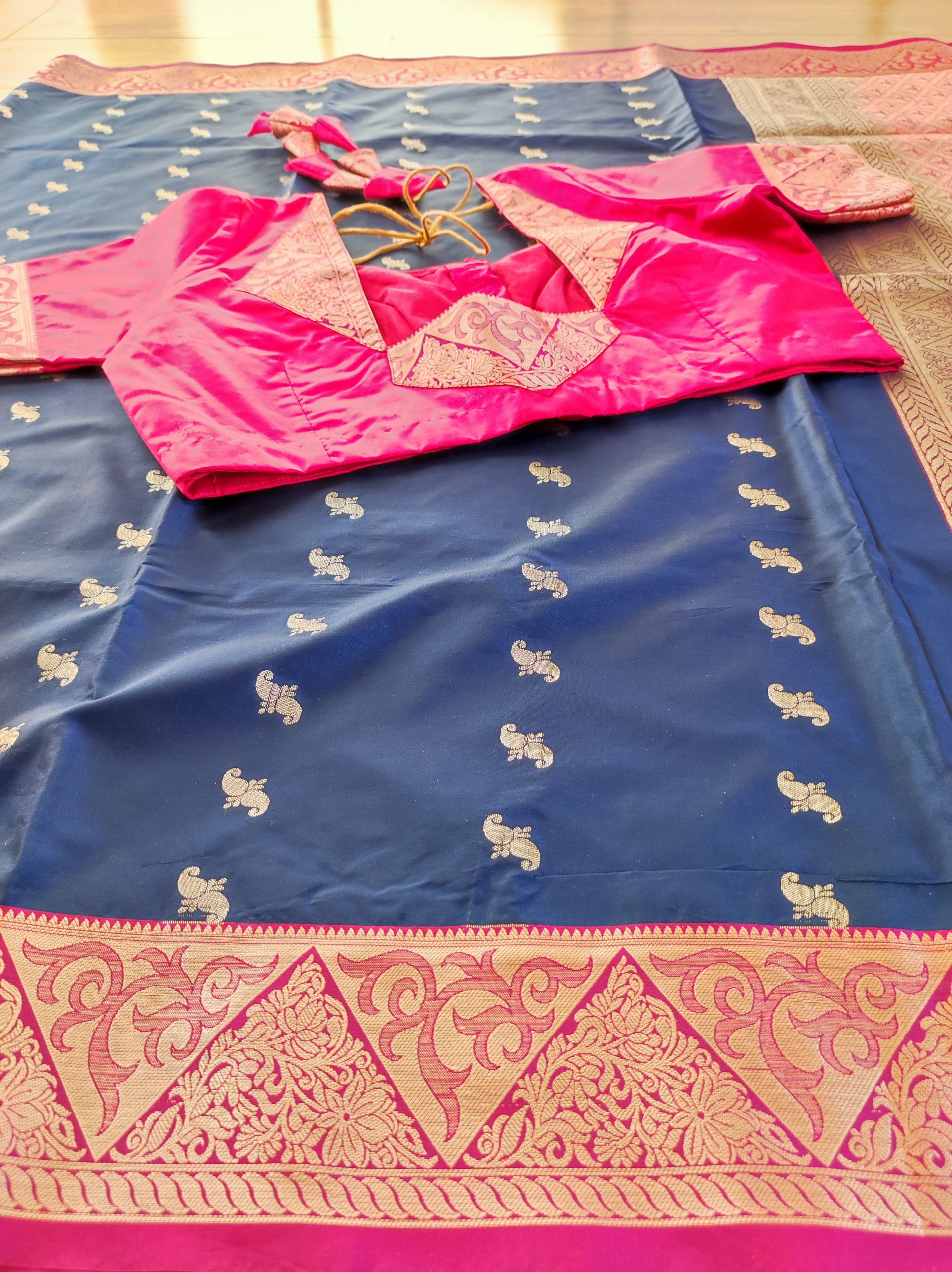 Pure handloom Kanchipuram Silk Saree in Navy blue colour with rani pink contrast colour Kanchi border with dull gold zari. Contrast colour pallu. Paired with contrast Rani pink colour blouse with beautiful patten at the back. Blouse size can be adjusted with the given fitting meausrements.