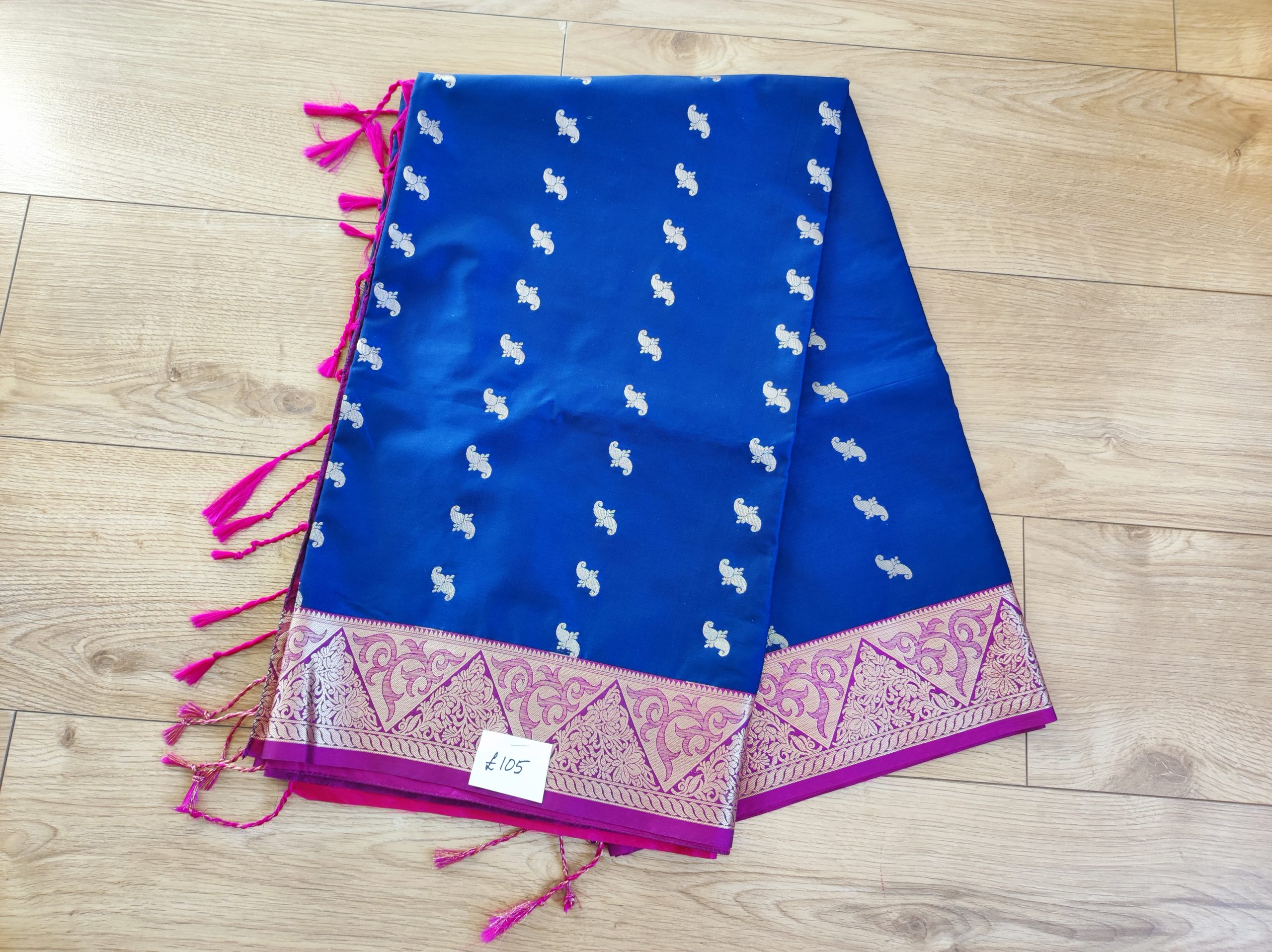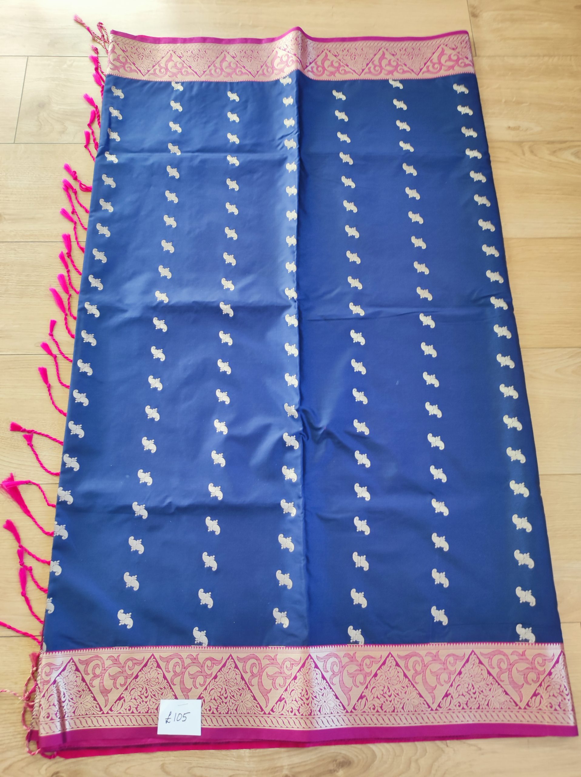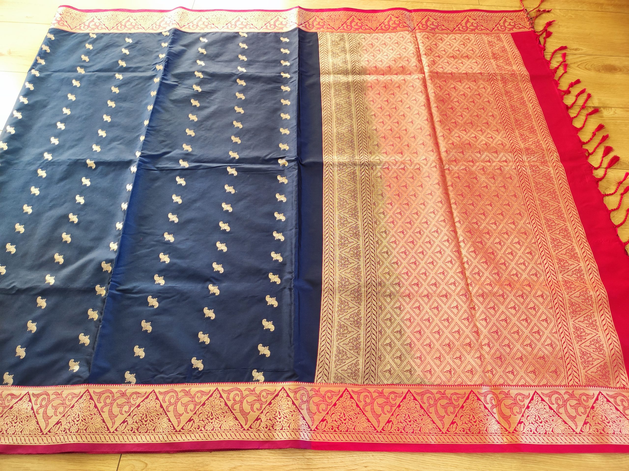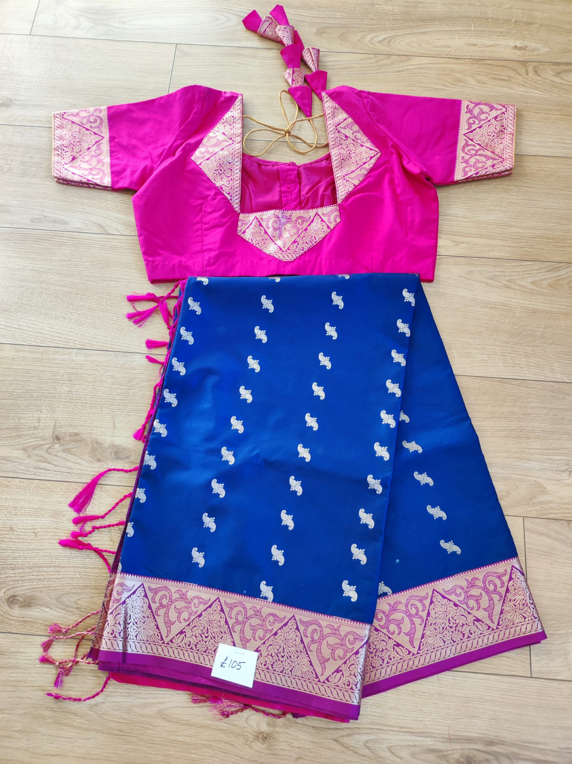 Pure handloom Kanchipuram Silk Saree in Navy blue colour with rani pink contrast colour Kanchi border with dull gold zari. Contrast colour pallu. Paired with contrast Rani pink colour blouse with beautiful patten at the back. Blouse size can be adjusted with the given fitting meausrements.
